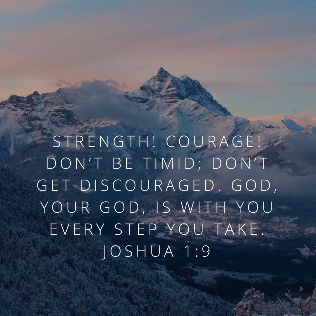 “Strength! Courage! Don’t be timid; don’t get discouraged. God, your God, is with you every step you take.” Joshua 1:9
